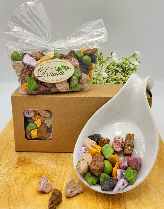 Unsere schokolierten Steinwaldkieselchen sind der ideale Snack für Schokoladenliebhaber. Diese fantasievollen "Steine" bestehen aus einem knusprigen Kern, der von einer zarten Schokoladenschicht umhüllt ist. Bunt dragiert und optisch ansprechend, bieten sie einen intensiven Kakaogeschmack, der auf der Zunge zergeht. Ob als süßer Snack für zwischendurch oder als besonderes Highlight zu Desserts – die Steinwaldkieselchen sind vielseitig und unwiderstehlich. Perfekt zum Verschenken oder Selbstgenießen!
